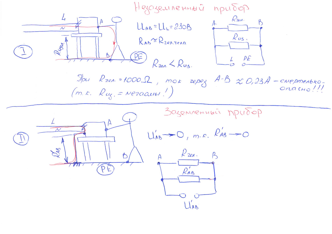 Тогда в чем смысл фразы снижения потенциала прикосновения?Судя по рисунку заземление служит для отработки АВ.Конечно если человек будет в резиновой толстой подошве то его и не ударит током так как он изолирован от земли и через него не потечет фаза к источнику.Получается заземляющие устройство не снижает потенциал прикосновения а только защищает от КЗ на корпус или если диф автомат он увидит утечку тока на корпус прибора который заземлен и утечка больше 30мА то он отработает обесточив сеть.Так получается.