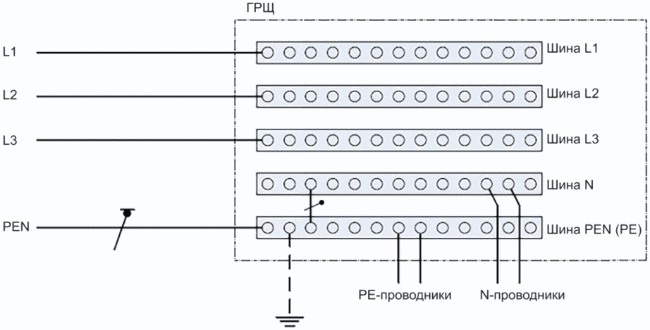 "- система TN-C-S (система распределения электроэнергии, имеющая тип заземления системы TN-C-S), в которой в части системы применяют единый проводник, выполняющий функции нейтрального или заземленного фазного и защитного проводников (см. рисунки 31В1, 31В2 и 31В3). В электроустановках жилых и общественных зданий, торговых предприятий, медицинских учреждений запрещено применять PEN- и PEL-проводники. PEN- или PEL-проводник распределительной электрической сети должен быть разделен на нейтральный или заземленный фазный проводник и защитный проводник на вводе электроустановки (см. рисунки 31В2 и 31В3)"И вот это "на вводе электроустановки" трактуется им как на вводе электроустановки кабинета. Тем более, что картинка в ГОСТе вполне может быть использована для такой трактовки
